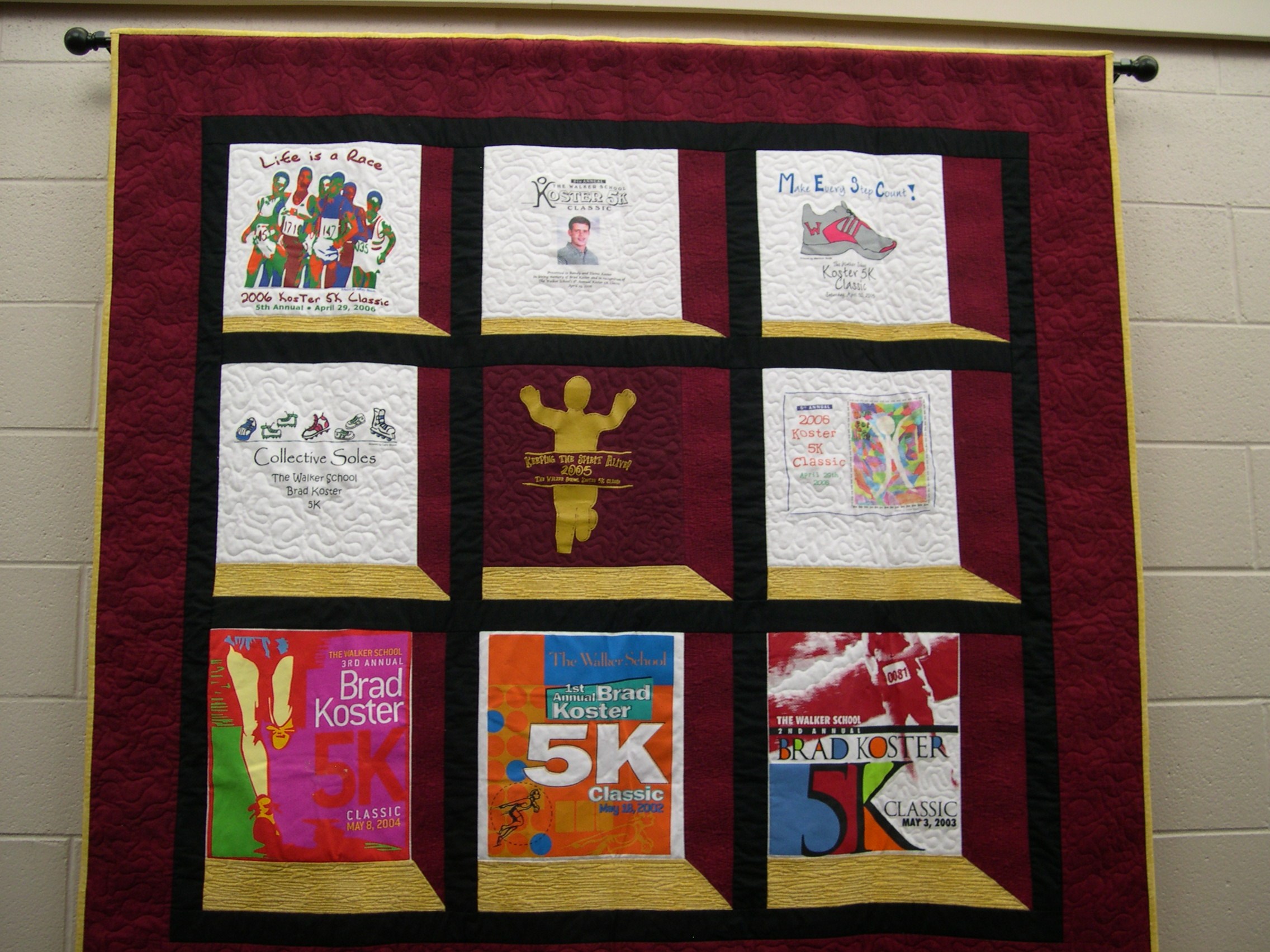 Clink on the pictures above to see the retired jersey and memorabilia quilt made from T-Shirts of previous years race. These now hang in the school gym